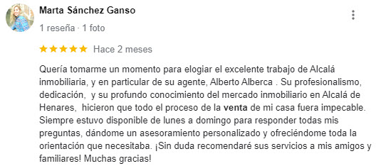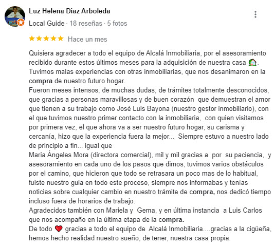 Agradecemos a todos ellos sus testimonios, que ayudan a otras personas, en situaciones similares de comprar y/o vender vivienda en Alcalá, a tomar las mejores decisiones (pulsa para ver la reseña original).