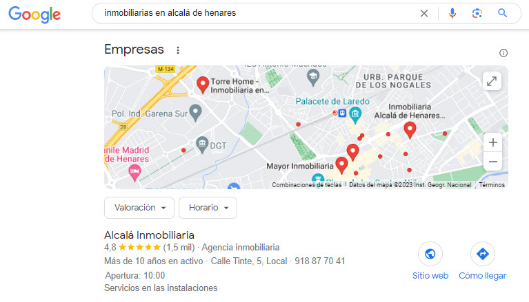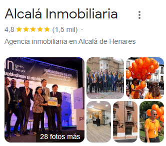 La cantidad y calidad de las reseñas, es uno de los factores que mide Google, para presentar el orden de los negocios locales; si buscas «inmobiliarias en Alcalá de Henares«, porque estés buscando asesoramiento para la compraventa de una casa en Alcalá, verás que en los resultados se muestra un mapa de las inmobiliarias de la zona, donde aparece Alcalá Inmobiliarias con sus datos, incluidas las reseñas: